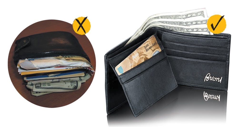 Носите в бумажнике необходимый минимум: немного наличных, кредитные карточки, небольшие фотографии своей семьи. Остальное можно положить в портфель. Тогда ваш бумажник (конечно же, дорогой и качественный) не потеряет форму и еще долго прослужит вам в солидном виде.