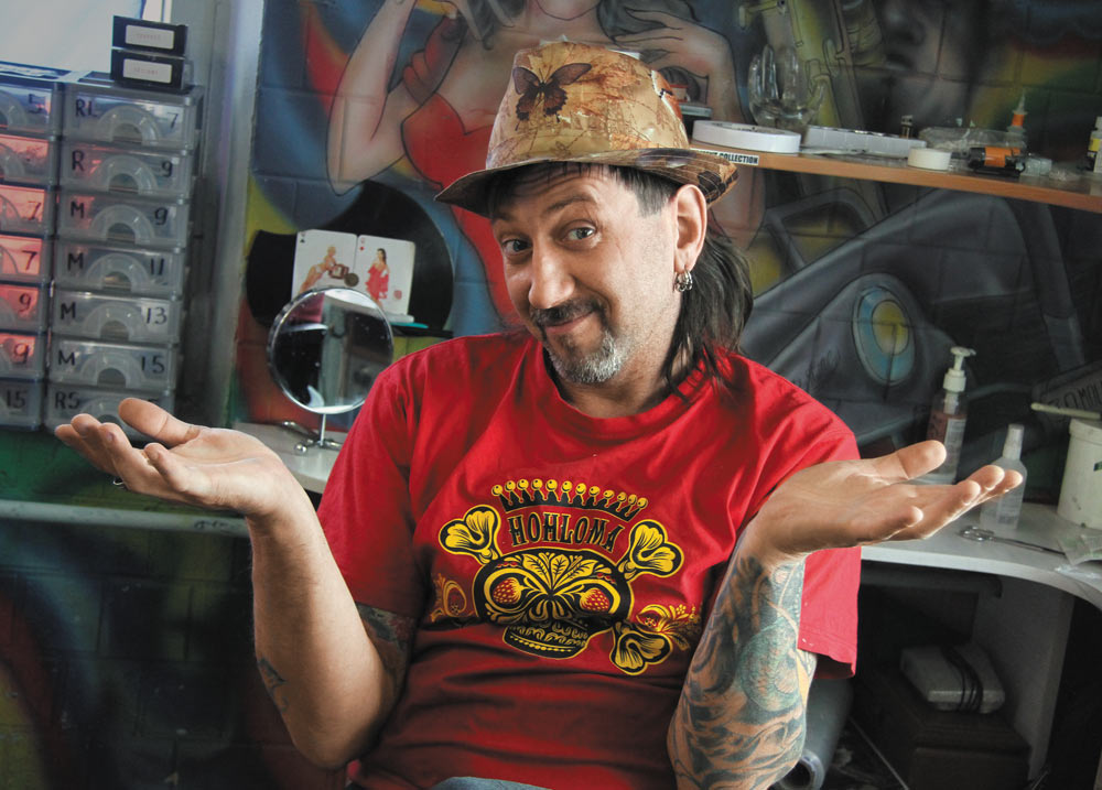 Я решил попробовать, что это такое, – как ложится краска, как проходит процесс заживления. Взял самодельную машинку и начал ваять на мизинце левой руки. Получилось не понять что, просто такой экспромт. В те же годы я сделал первые татуировки своим сослуживцам, с которыми мы вместе проходили службу на флоте. Тогда ко мне выстраивались очереди. Можно сказать, они были моими первыми подопытными (шутка). Соответственно, это были различные корабли, акулы, якоря и все, что связано с морской тематикой.Мои работы на своих телах носят многие знаменитости, артисты, политики. Например, Йохан, директор шведской рок-группы Sabaton, – они приезжали вместе с группой Scorpions.Товарищ познакомил его с моим творчеством еще в Москве, и с того дня Йохан ждал, когда мы встретимся, чтобы сделать, как он говорил, «сиберия тату». И вот за день до концерта Scorpions в Омске меня познакомили с ними в гостинице, а на следующее утро они почти в полном составе приехали в салон. Я сделал ему татуировку – череп, окантованный хохломой, а барабанщик «Скорпов» Джеймс Коттак подарил мне свои барабанные палочки. И мы отсюда сразу же поехали на концерт в «Арену-Омск».