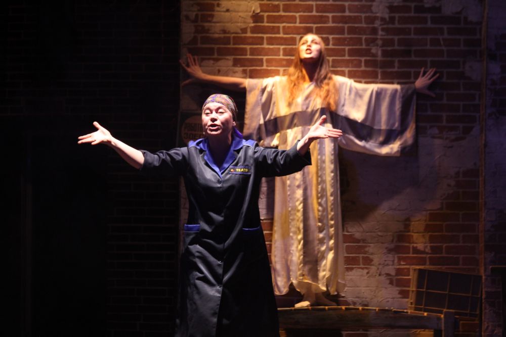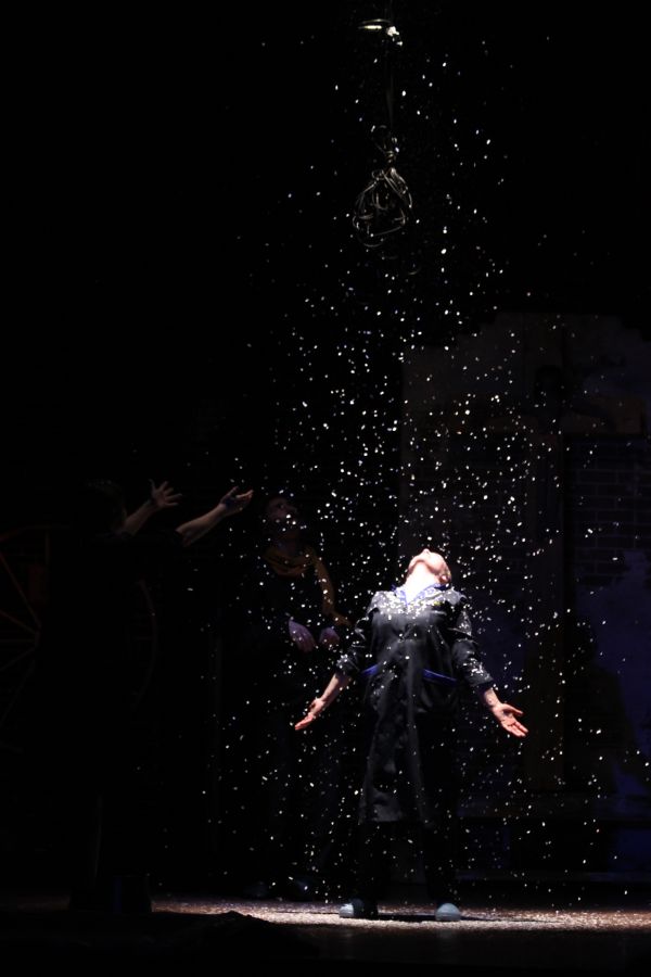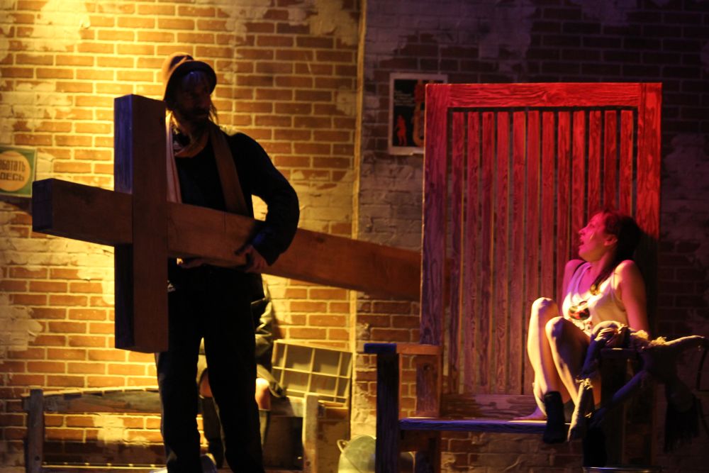 За простым на первый взгляд сюжетом на самом деле скрывается вереница символов и смысловых пластов. Например, в середине спектакля на сцене, представляющей собой облезлый внутренний дворик театра, неожиданно появляется крест с бутафорской куклой Христа. «Я разгадал этот символ, появившийся в пьесе Садур, - поделился режиссер. - Люди часто говорят о вере, о самых высоких материях, однако сами живут низко и отвратительно. Даже здесь они не могли порядочно отнестись к этому существу, к этой никому не нужной поделке, которая олицетворяет у них Бога». Этот загадочный крест выносит на сцену глухонемой по имени дядя Лева, живущий в подвалах театра. Кстати, кроме него никто из героев пьесы больше не видит призрак актрисы. У Нины Садур именно этот юродивый оказывается более проницательным и чувствительным, чем остальные персонажи.
