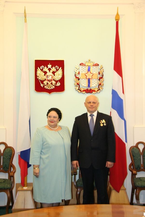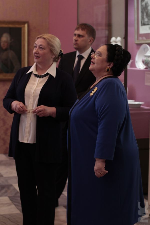 Похоже, синий — любимый цвет великой княгини. Для встречи с губернатором Виктором Назаровым на следующий день государыня выбрала элегантный голубой костюм.