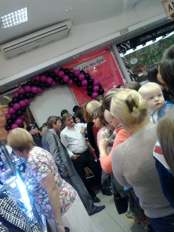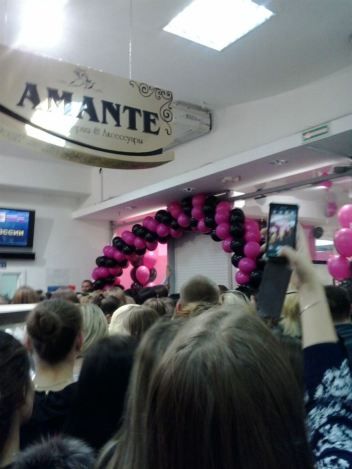 Фанаты буквально щемились к своим кумирам. Для удобства было решено запускать людей в магазин небольшими группами. Малейшее движение дверей и жалюзи в витрине магазина, поклонники встречали бурными эмоциональными всплесками. А лица покидающих бутик фанатов светились от счастья. В толпе «за стеклом» раздавалось: «Что Пынзари с ними делают? Что там происходит? Пустите нас!!!». Нашлись и «кадры», кричащие: «Я тоже хочу на «Дом-2». Спустя полтора часа арендаторы вспомнили, по какому поводу собрали народ и сделали «ход конем». Представитель Пынзарей объявил, что сфотографироваться с Дашей и Сережей можно будет только совершив покупку в их магазине. В ту же минуту толпа поредела. Красотка Даша переоделась в модное платье в пол с разрезом до колен. Оставшихся адекватных поклонников пустили внутрь и фотосессия продолжилась.