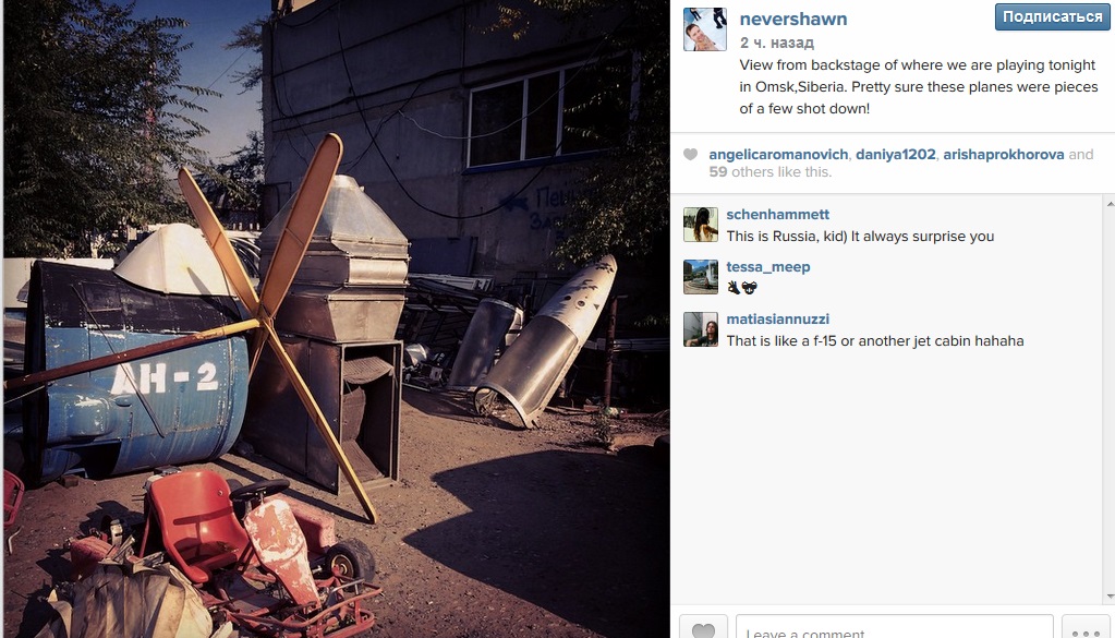 Коллектив должен был выступить в ночном клубе ANGAR в 19 часов, однако концерт перенесли на час в связи с задержкой самолета, на борту которого находится оборудование рок-музыкантов. Однако участники Three Days Grace не скучают. Их уже успели позабавить некоторые омские вещи, они удивились «обломками вертолета» за клубом ANGAR и сфотографировали объекты. Снимок на страницу в instagram выложил Шон Хэмм, он занимается организацией гастролей группы.