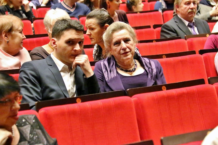 В зале был замечен телеведущий Евгений Нифанов, сопровождавший взрослую даму.