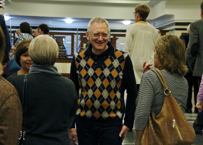 За роялем был сам Анатолий Кролл, который начал концерт с попурри из музыки, написанной им к кинофильмам, в том числе к «Мы из джаза». Прикоснуться к истории джазовой музыки и услышать известные мелодии в исполнении автора в этот вечер решили экс-директор департамента финансов мэрии Сергей Толкачев, который предпочел абсолютно джазовый внешний вид - свитер с ромбами.