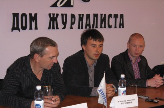 Презентация в Омске фильма «Анатомия чемпиона», который стал победителем и лауреатом двух международных фестивалей документального кино. Слева направо: заслуженный артист России, лауреат театральной премии «Золотая маска» Михаил Окунев (закадровый голос), режиссер Владимир Головнев, заслуженный мастер спорта России, двукратный чемпион Олимпийских игр Алексей Тищенко