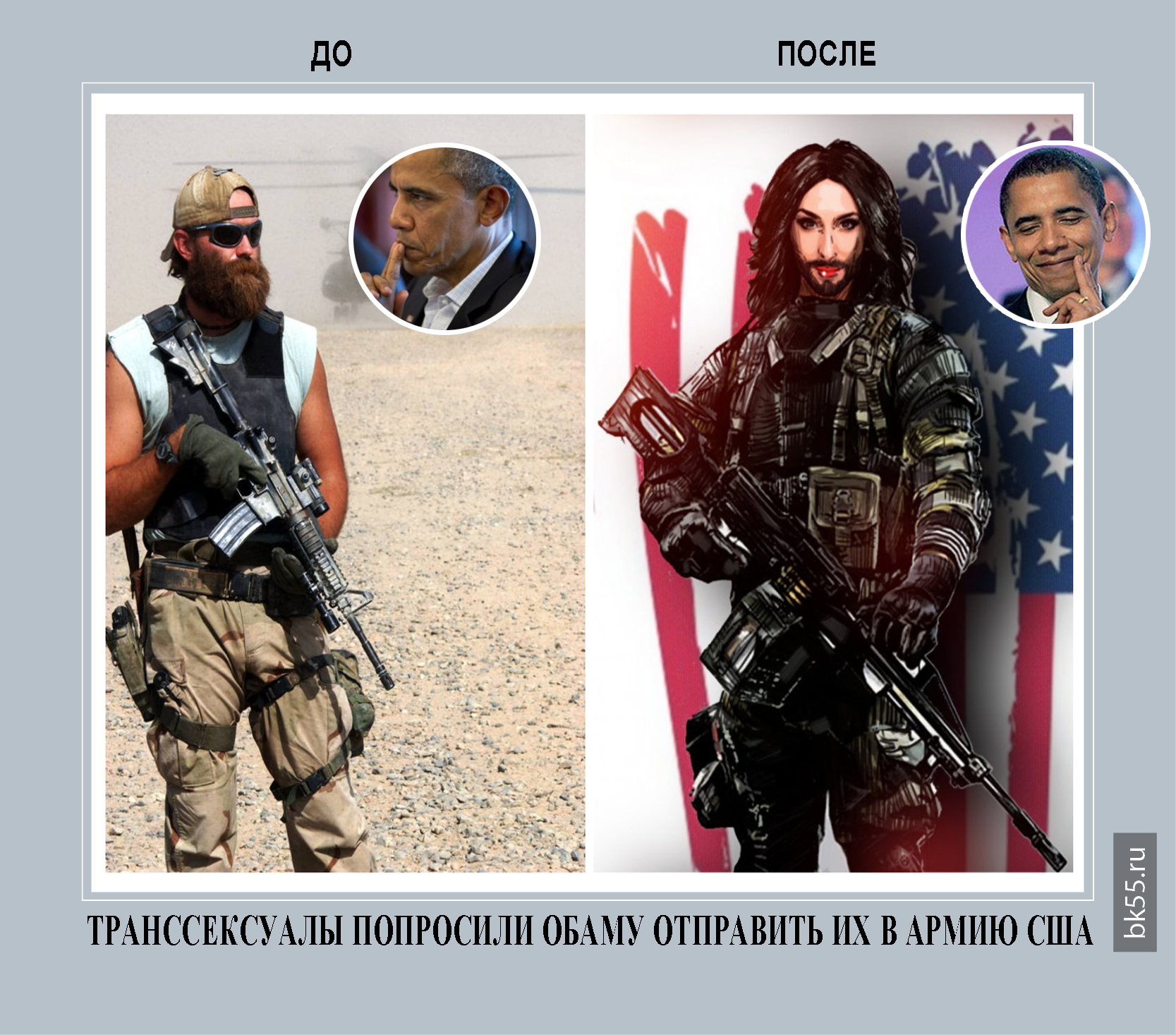 Транссексуалы пытаются обойти Конгресс и Пентагон и умоляют «своего защитника» Обаму напрямую издать указ об их допуске в армию. Примерно также в свое время сработали геи и лесбиянки, добившиеся в ряде штатов разрешения на однополый брак.