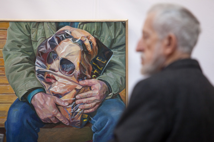 Известный омский художник Сергей Сочивко был в отличном настроение. Общался со многими посетителями и с удовольствием рассказывал про свои картины.
