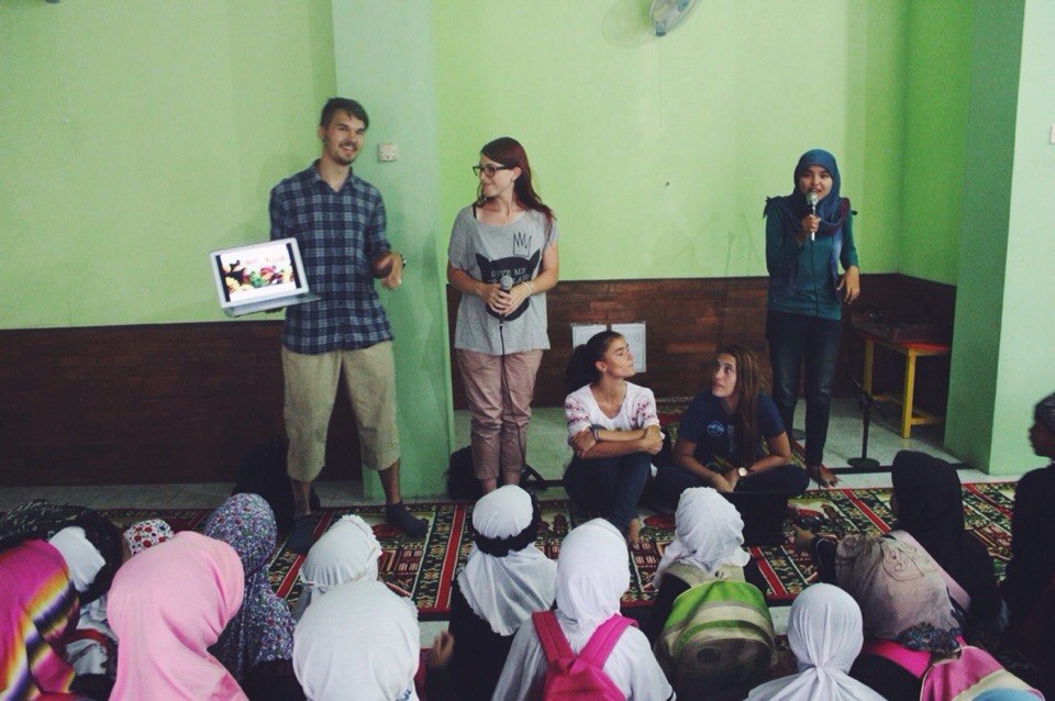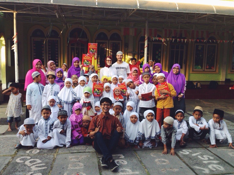 На занятиях с ребятишками мы разбились на группы, и каждый стажер учил детей основным фразам из своего языка. А ребята в моей группе взамен научили меня индонезийскому алфавиту и полезным выражениям. Потом мы проводили игры, а точнее, играли в глухой телефон на всех доступных языках: румынском, немецком, русском, португальском, английском и индонезийском. Жена хозяина детского дома подарила мне традиционный платок на голову наподобие хиджаба, сказав, что ей будет приятно, если я буду носить его, когда прихожу заниматься с детьми. А несколько дней назад и Роме презентовали так называемую peci (kopiah). Так что потихоньку сливаемся с толпой.