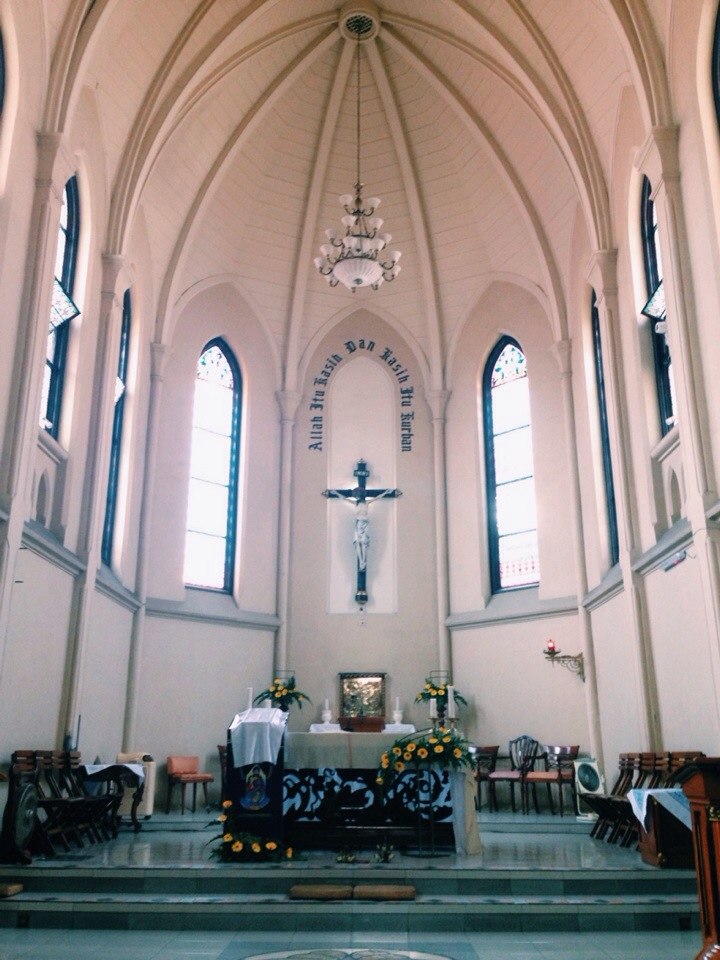 Неподалеку от парка Alun-Alun находятся мусульманская мечеть и католическая голландская церковь, оставшаяся с колониальных времен. Приветливые служители даже проводили нас внутрь. Там была странная помесь разных религий: надпись про Аллаха в центре и страсти Христовы по стенам.