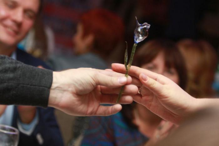 Аукцион начался с выступления омских стеклодувов, они и предоставили первые лоты вечера, сделанные из художественного стекла: милую овечку и изящный тюльпан. Оба лота собрали по 10 тысяч рублей.