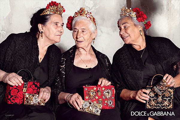 Именитые дизайнеры сами выступили организаторами съемки - Доменико Дольче взял в руки фотоаппарат, а Стефано Габбана стал арт-директором кампании. Для демонстрации аксессуаров модный дуэт пригласил пожилых испанок. Сумки с пестрой барочной вышивкой, золотые диадемы с крупными алыми кристаллами, гипюровые кардиганы и массивные золотые серьги выгодно смотрятся на лаконичных черных платьях старушек.