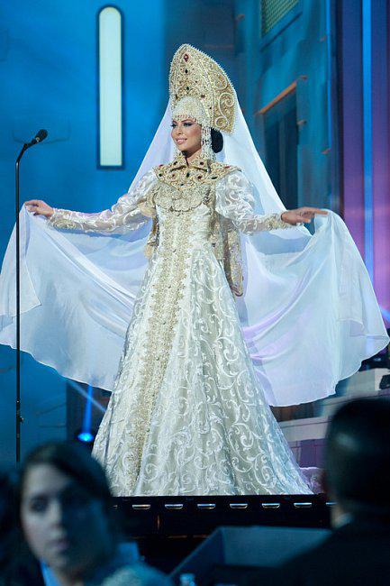 В интернет попали фотографии красавиц с последней репетиции перед шоу, в том числе и снимок Юлии Алиповой в национальном костюме. Платье девушки изготовлено по эскизу модельера Глеба Винокурова и расшито вручную камнями и жемчугами. По словам Алиповой, костюм отражает «богатую культуру нашей великой страны».