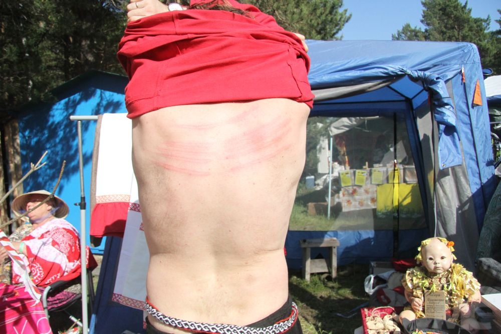 На этнофестивале «Солнцестояние» прошли мастер-классы по самым разным направлениям. Но одним из самым эпатажных и зрелищных стал семинар по розготерапии. Психолог, гипнолог Герман Пилипенко специально приехал из Новосибирска, чтобы рассказать о методе розготерапии. Как выяснилось, этот метод дошел до современности из глубины веков, а сейчас его вполне можно применять для лечения телесных недугов, алкоголизма и депрессии, страхов и неуверенности в себе. Омский рекламист Александр Немчанинов, который все чаще появляется на публике в косоворотке, на себе испытал эффект от традиционной славянской порки. Сев на стул, он пожаловался Пилипенко на проблемы с давлением. Тот, проведя с ним небольшой сеанс психотерапии, закрепил свои слова розгами. От порки у Немчанинова осталось несколько красных следов, которые он показал "МС2".