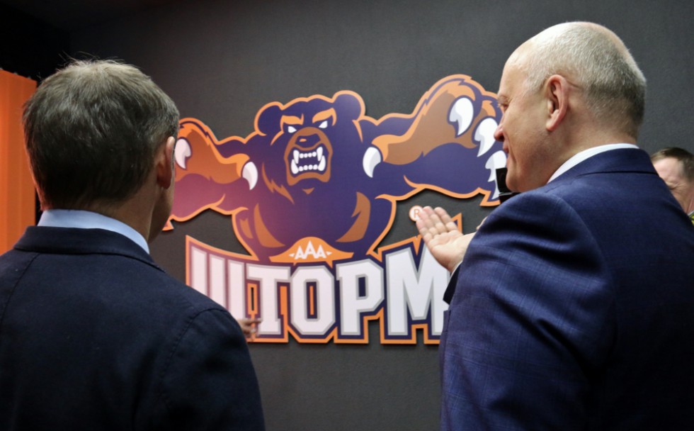 Шлеменко провел для омской правительственной делегации, состоящей из Виктора Назарова и министра спорта Александра Фабрициуса, подробный экскурс по коридорам новенькой школы, в ходе которого также продемонстрировал внушительную и красочную эмблему «Шторма».