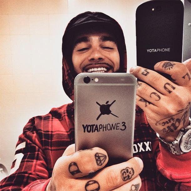 На своей официальной страничке в Instagram Тимати опубликовал фотографию, на которой позирует с двумя телефонами: iPhone и YotaPhone. Причем на американском смартфоне маркером перечеркнута эмблема и сделана подпись YotaPhone 3.