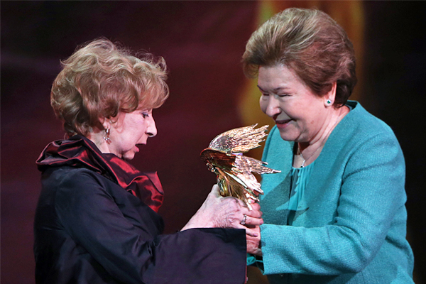 Вдова первого президента России Наина Ельцина (справа) вручает почетную «Нику» - «За честь и достоинство» народной артистке РФ Лие Ахеджаковой