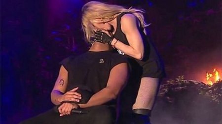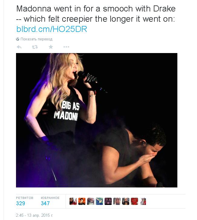 Мадонна и молодой рэпер Дрейк выступали вместе на сцене. В какой-то момент Дрейк сел на стул, а Мадонна, оказавшись рядом, буквально впилась в губы молодого исполнителя. Шокированная публика начала свистеть, а сам рэпер, освободившись от поп-иконы, не скрывая своего отвращения, нагнулся и вытер губы. Не получив должного эффекта Мадонна покинула сцену, так и не допев песню.