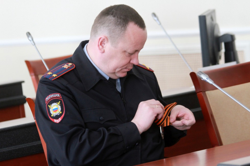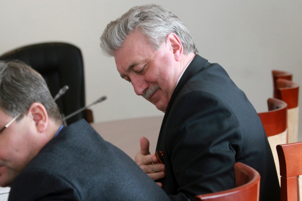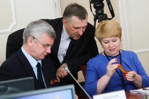 В зал заседаний все чиновники заходили одинаково — с георгиевскими ленточками в руках. Для мужской половины собравшихся в зале решение этой проблемы было простым — положить ленточку в нагрудный карман пиджака и вытащить наружу ее конец, дабы его было видно.