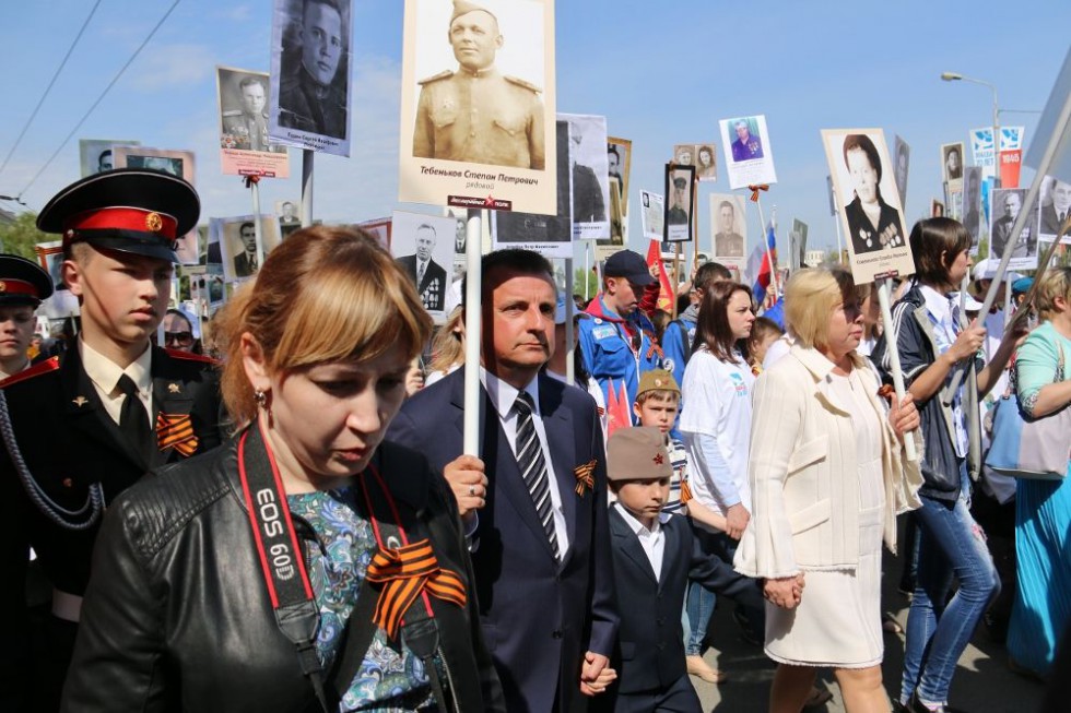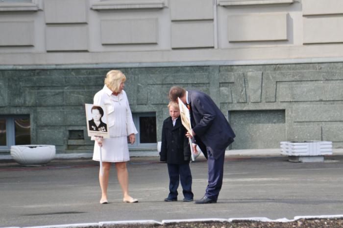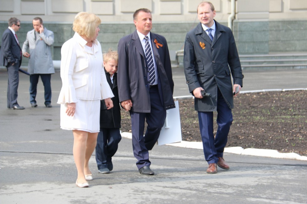Сегодня, 9 мая, на параде Победы самой яркой парой стало семейство Синюгиных. Супруга первого вице-губернатора, глава фонда «Дитя Вселенной» Татьяна Синюгина принесла два фото, чтобы принять участие в акции «Бессмертный полк». Вместе с ней был сынишка Петя, который выглядел уставшим и все время канючил.