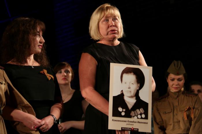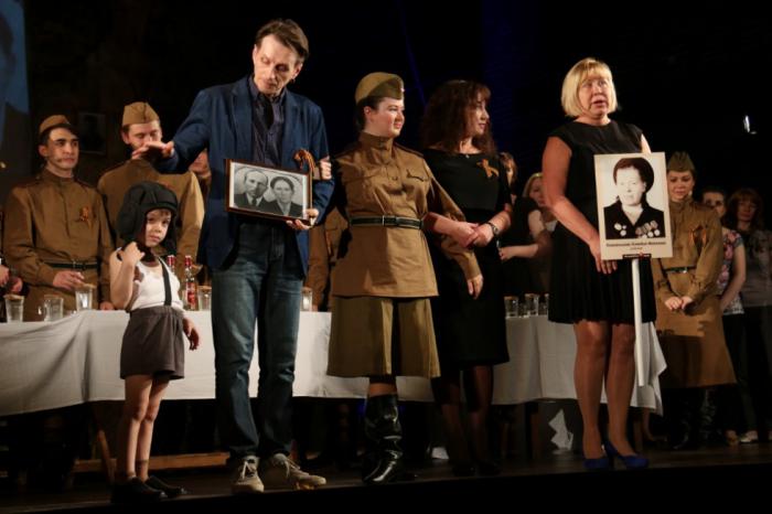 На протяжении всего спектакля звучали известные всем музыкальные композиции «Синий платочек», «Смуглянка» и многие другие. После каждой из них сотрудники театра выходили на сцену с портретами своих дедов и прадедов и рассказывали об их военных достижениях и подвигах, о славных боевых историях. В том числе на сцену поднялась и Татьяна Синюгина под руку с Нателой Полежаевой. Жена вице-гуребнатора вышла с портретом в руках, на котором была изображена ее мама Кожевникова Клавдия, отличившаяся за войну многочисленными наградами. С этим же портретом Синюгина вместе с мужем прошествовала с утра в «Бессмертном полку».