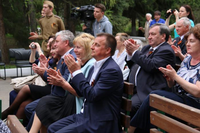 На протяжении всего спектакля звучали известные всем музыкальные композиции «Синий платочек», «Смуглянка» и многие другие. После каждой из них сотрудники театра выходили на сцену с портретами своих дедов и прадедов и рассказывали об их военных достижениях и подвигах, о славных боевых историях. В том числе на сцену поднялась и Татьяна Синюгина под руку с Нателой Полежаевой. Жена вице-гуребнатора вышла с портретом в руках, на котором была изображена ее мама Кожевникова Клавдия, отличившаяся за войну многочисленными наградами. С этим же портретом Синюгина вместе с мужем прошествовала с утра в «Бессмертном полку».