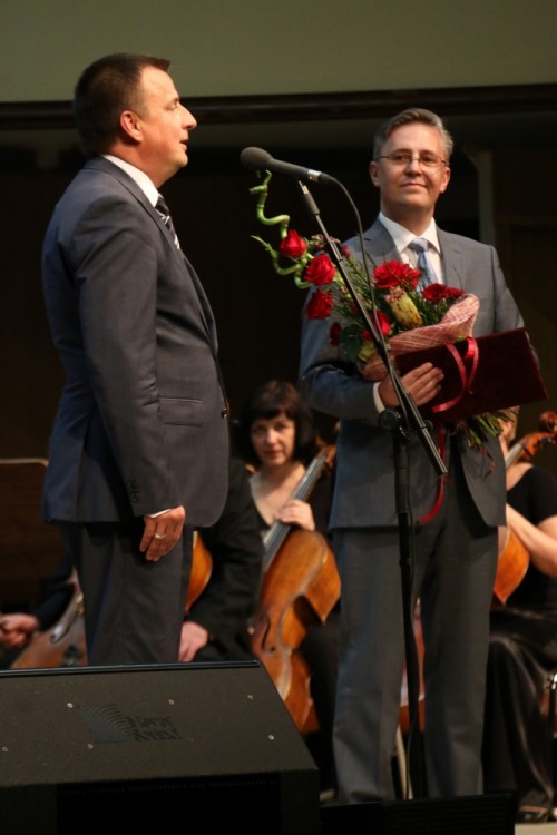 На юбилейном концерте директор областной филармонии Андрей Чувашов получает поздравление от «второго лица» региона Вячеслава Синюгина