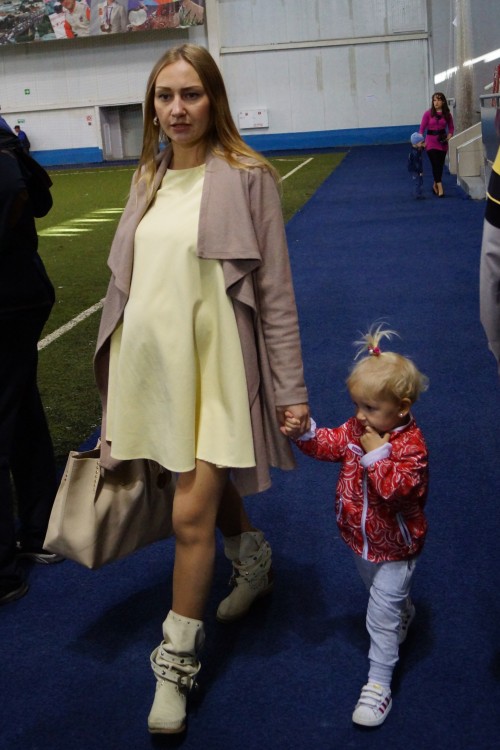 Стоит отдать должное, Алена прекрасно выглядит и в положении. Собираясь к мужу на футбол, она надела светло-желтое платье свободного кроя и легкий плащ темно-бежевого цвета. На ногах у девушки красовались удобные сапожки с пряжками и объемная сумка теплых нейтральных оттенков. Образ Алены был весьма комфортным, однако, несмотря на это, довольно гармоничным. Под руку она вела дочку, принаряженную в красную курточку и голубые джинсы.