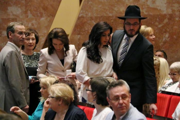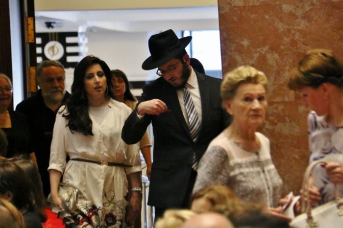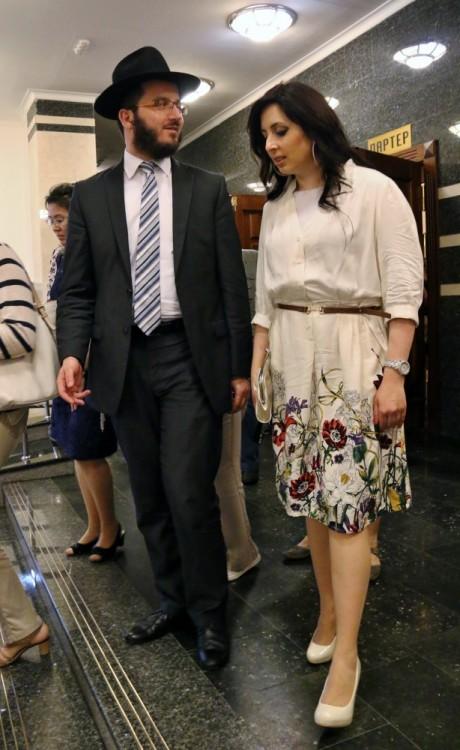 Жене раввина, жгучей брюнетке, оказался весьма к лицу оттенок наряда. Длина платья, чуть прикрывающая колено, была приличествующей супруге духовного лица и позволила продемонстрировать стройные ноги многодетной матери.