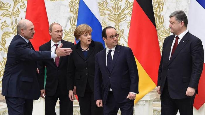 Александр Лукашенко, Владимир Путин, Ангела Меркель, Франсуа Олланд и Петр Порошенко