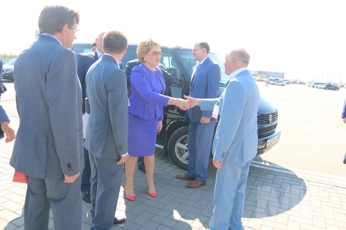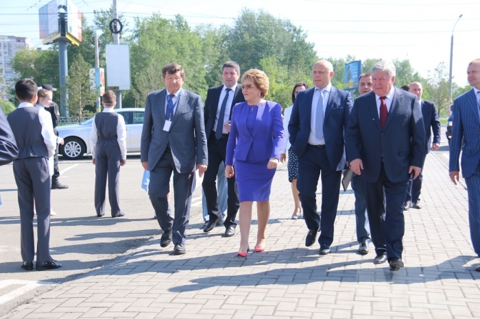 Сегодня, 5 июня, в Омск с официальным визитом прибыла спикер Совета Федерации России Валентина Матвиенко. Представитель парламента прибыла в ярко-синем облегающем талию наряде, дополненном яркими туфлями.