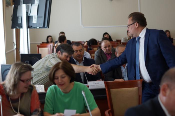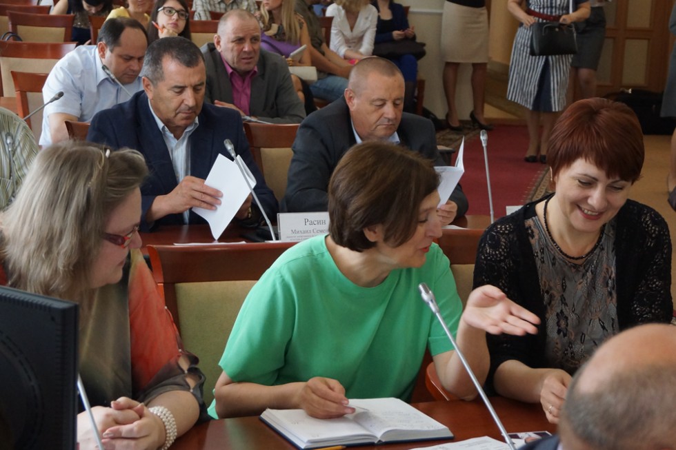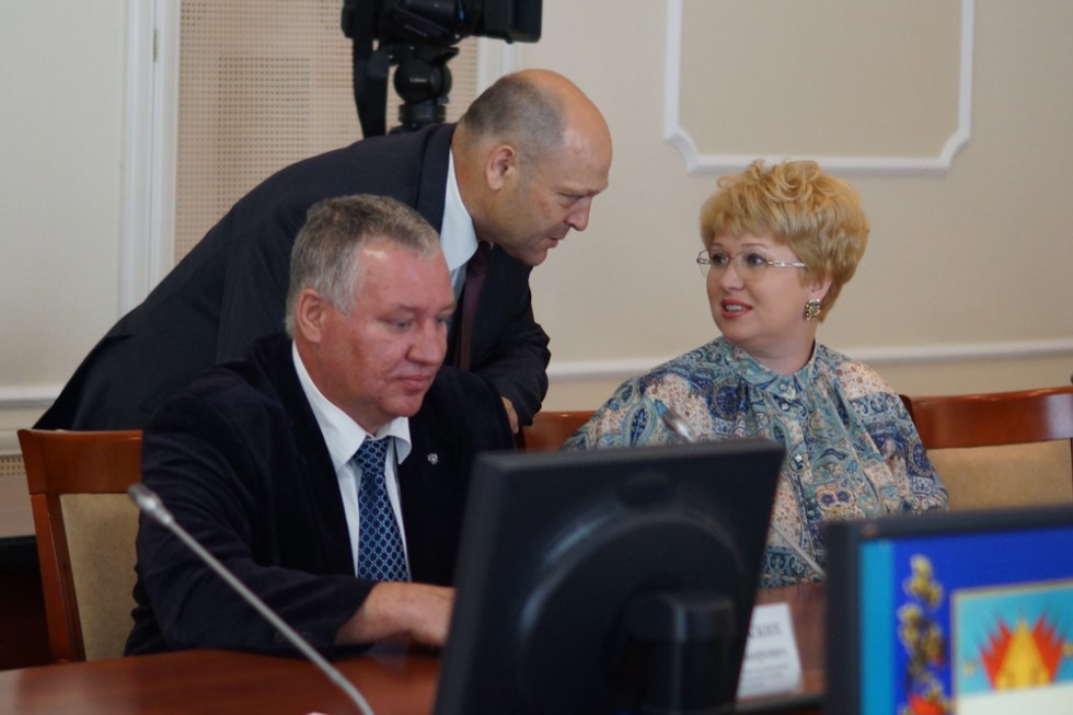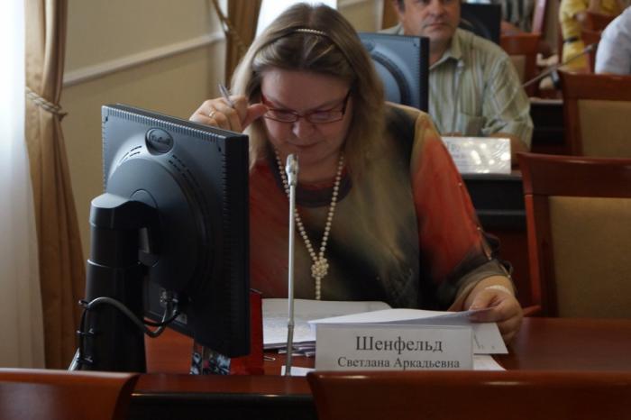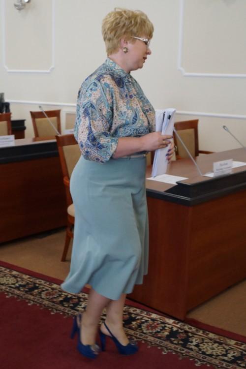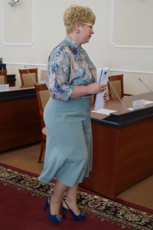 Тем временем руководитель департамента информационной политики Ирина Загатова продемонстрировала легкую зеленую блузку, сильно контрастирующую с желто-серым цветовым оформлением зала заседаний.