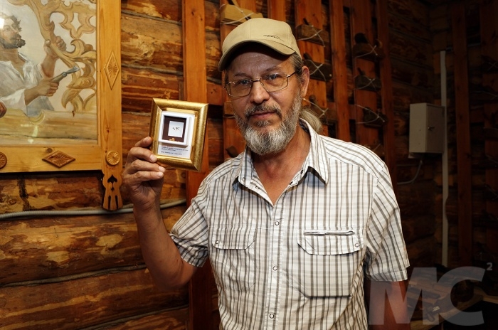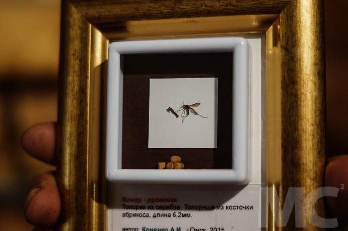 «Всегда, когда открывается какая-нибудь выставка или музей на омской земле, в ней обязательно должна быть самая маленькая вещица. Поэтому сегодня вы увидите самый маленький топор, который я привез для того, чтобы пополнить коллекцию дяди Вани. Композиция называется «Комар-дровосек», - сказал Коненко, вызвав смех у всех присутствующих. В руках у комара топорик, который сделан из серебра и абрикосовой косточки. Размер такой, что топор хорошо ложится на рисовое зернышко. - Думаю, что этот экспонат украсит музей», - этими словами микроминималист завершил свою речь.