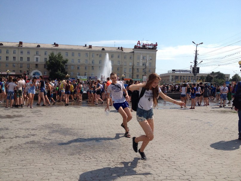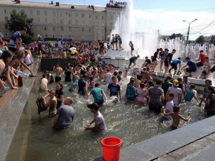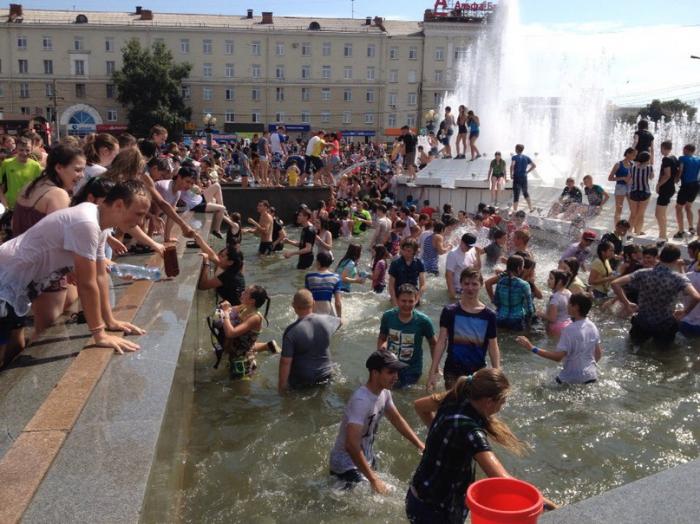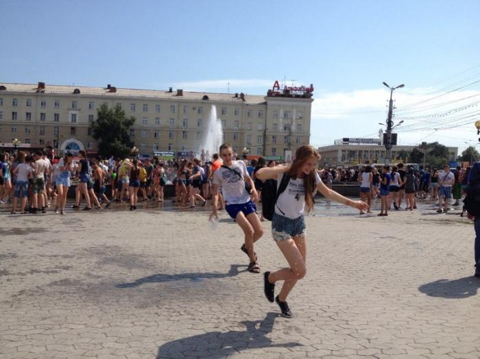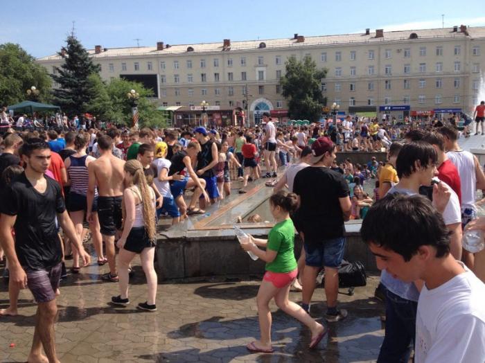 Несколько сотен собравшихся бесновались под ритмичную музыку и бодрый голос ведущего. Стремясь обрести спасительную прохладу, они активно обливались водой и прыгали в фонтан, вода в котором стремительно таяла на глазах. Ею молодые люди "заряжали" свои брызгалки и водяные пистолеты и с удовольствием носились по площади.
