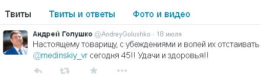 «Настоящему товарищу, с убеждениями и волей их отстаивать @medinskiy_vr сегдня 45!! Удачи и здоровья!!», - написал в своем Twitter Голушко.