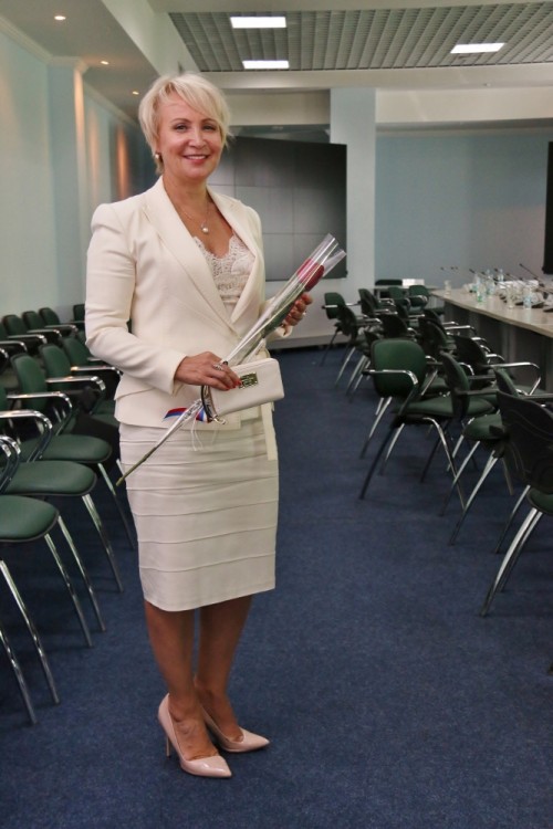 На церемонию награждения лучших работников торговли и общественного питания была приглашена президент Ассоциации Омских кулинаров Светлана Галкина. Для выхода в свет она выбрала деловой костюм молочного цвета.