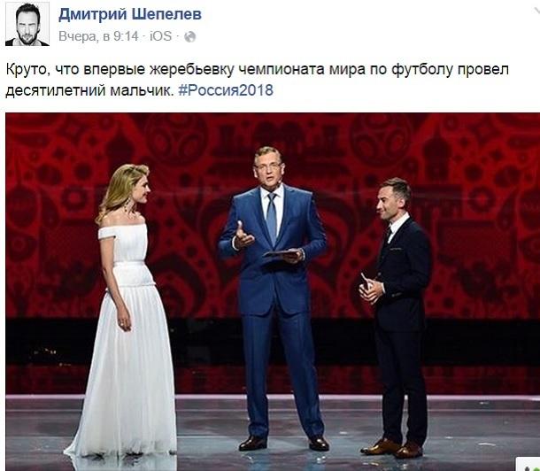 «Круто, что впервые жеребьевку чемпионата мира по футболу провел десятилетний мальчик», - написал с юмором Шепелев в своем Facebook.