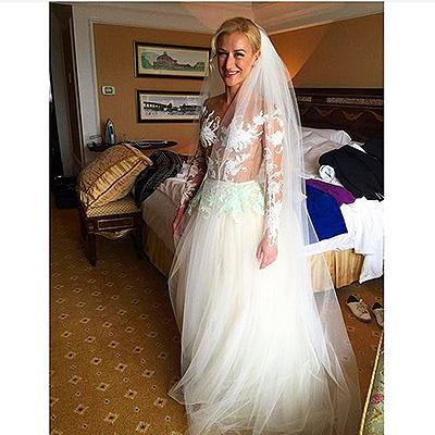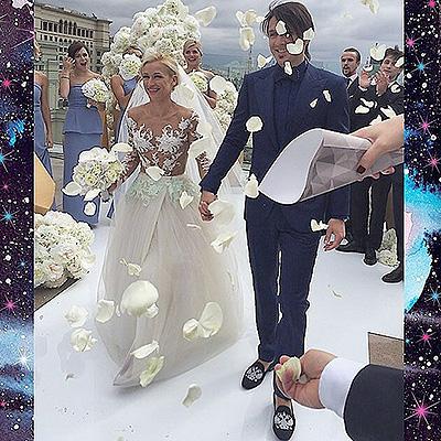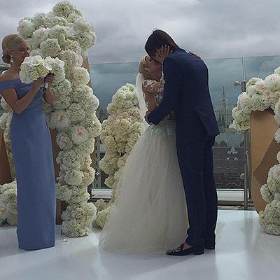Сияющая невеста предстала в платье от известного российского дизайнера Алены Ахмадуллиной. В качестве гостей на церемонию были приглашены представители шоу-бизнеса: Евгений Плющенко, Екатерина Климова и Татьяна Тотьмянина, а подружками невесты стали певица Анастасия Задорожная и олимпийская чемпионка Аделина Сотникова.