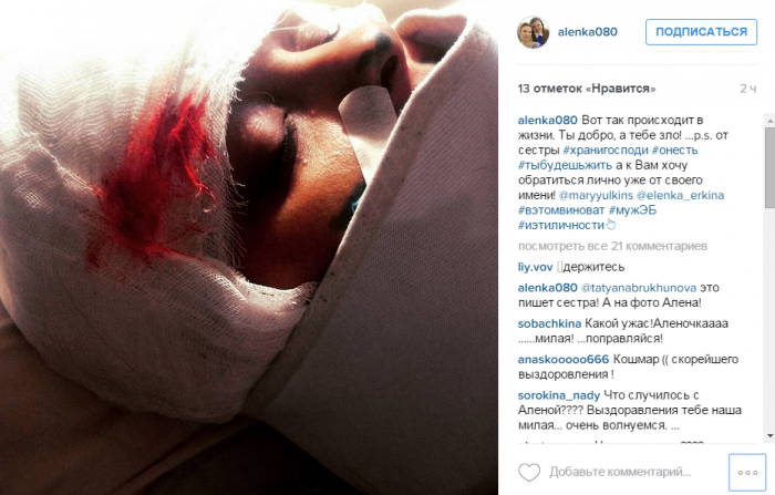 Настоящий скандал разгорелся вокруг семьи актрисы, телеведущей и певицы Эвелины Бледанс. Алена Волкова, которая представилась няней 3-летнего сына Бледанс и Семена Семёна, обвинила Александра в жестоком обращении. О том, что Волкова серьезно пострадала, сообщила ее сестра в Instagram, опубликовав фото Алены в бинтах, через которые проступает кровь. Отметим, что в социальной сети женщина открыто не говорит, что именно произошло, а только делает всяческие намеки.