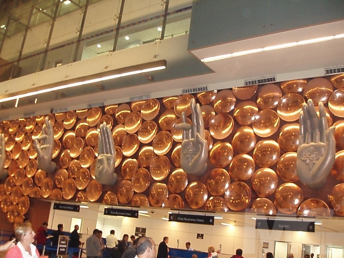 Шестичасовой перелет в Дели из Москвы закончился, мы - в аэропорту Индиры Ганди в Нью-Дели, идем мимо стены, на которой размещены скульптуры кистей рук, на них - застывшие в определенном жесте пальцы. Это мудры. Каждая выражает свой смысл: любовь к ближнему, приветствие путешествующему, пожелание здоровья.