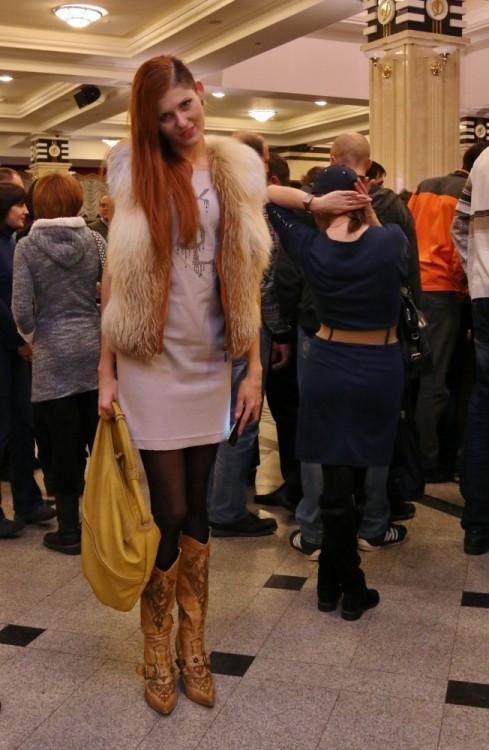 Высокая молодая дама к длинному приталенному платью как аксессуар добавила бусы из жемчуга, использовав их в качестве браслета. Фотографу МС2 удалось узнать имя красавицы. Жанна Голикова - так назвалась поклонница творчества группы «Пикник», более не сообщив никаких подробностей о себе.