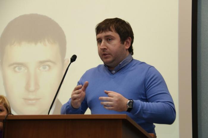 Андрей Шаркеев, наоборот, поставил на образ «рубахи-парня». Об этом говорили и его вызывающе-обычная синяя кофта (одинокий парус в море чёрных пиджаков), и простая, местами импровизированная, но искренняя речь.
