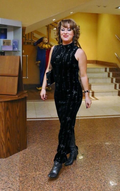 Дама облачилась в темное облегающее платье с растительным орнаментом, подчеркивающее прекрасные физические кондиции г-жи Кондрашиной. Образ был дополнен сапогами из змеиной кожи. Их хорошо можно было рассмотреть в разрезе платья.