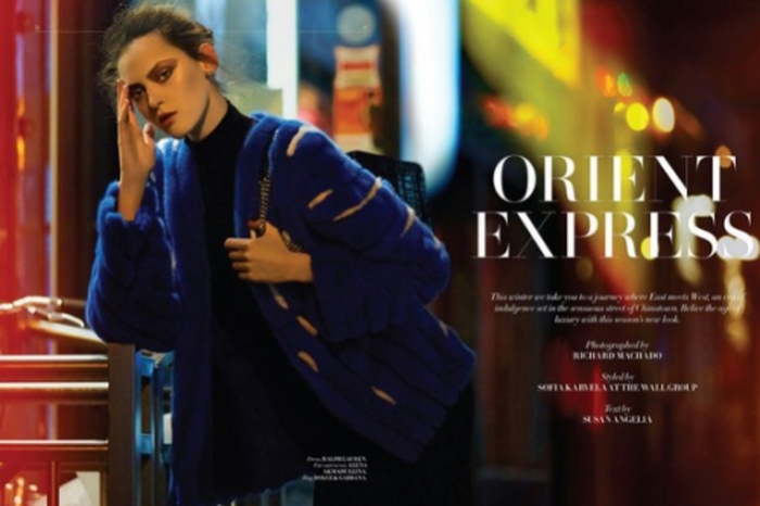 В серии фотографий, которая названа«Orient Express», главная роль отведена 25-летней омичке Светлане Мухиной. Девушка позирует на фоне декораций в китайском стиле. Модель рекламирует одежду и аксессуары таких модных модных марок как Valentino, Max Mara, Alexander Wang и другие.