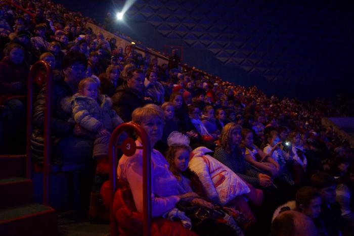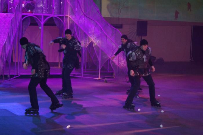 Артисты были из Тары и показывали свою версию «Снежной королевы», а по ледовой арене СКК ездили на роликовых коньках лауреаты Президентской премии – молодые артисты Северного драматического театра.