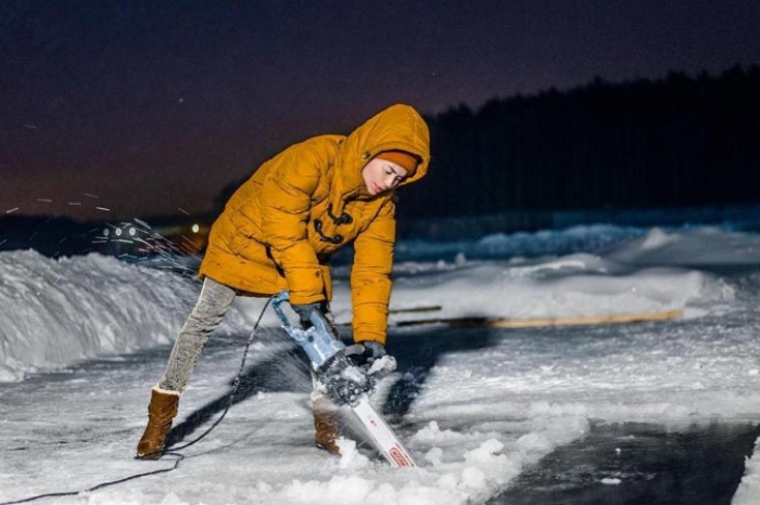 Вчера вечером Юля решила сделать оригинальный подарок жителям отельного поселка «Рамада» под Екатеринбургом, где команда «Шоу Уральские пельмени» ночевала перед вылетом на гастроли. Актриса решительно вышла на замерзшее озеро поселка и, вооружившись электропилой и лопатой, сделала Крещенскую купель.