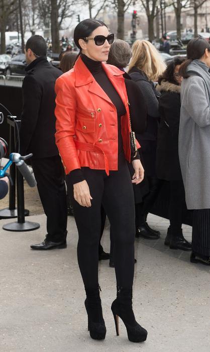 Звезда из Италии приехала на модный показ в черных облегающих леггинсах, черной полупрозрачной водолазке и красной кожаной куртке Chanel.