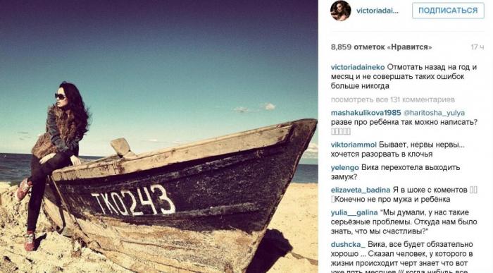 Вчера певица Виктория Дайнеко удивила подписчиков, разместив в Instagram снимок и снабдив его загадочной надписью: «Отмотать назад на год и месяц и не совершать таких ошибок больше никогда». К тому же поклонники заметили, что из микроблога исчезли все фото, на которых Виктория была вместе со своим супругом, 21-летним Дмитрием Клейманом.