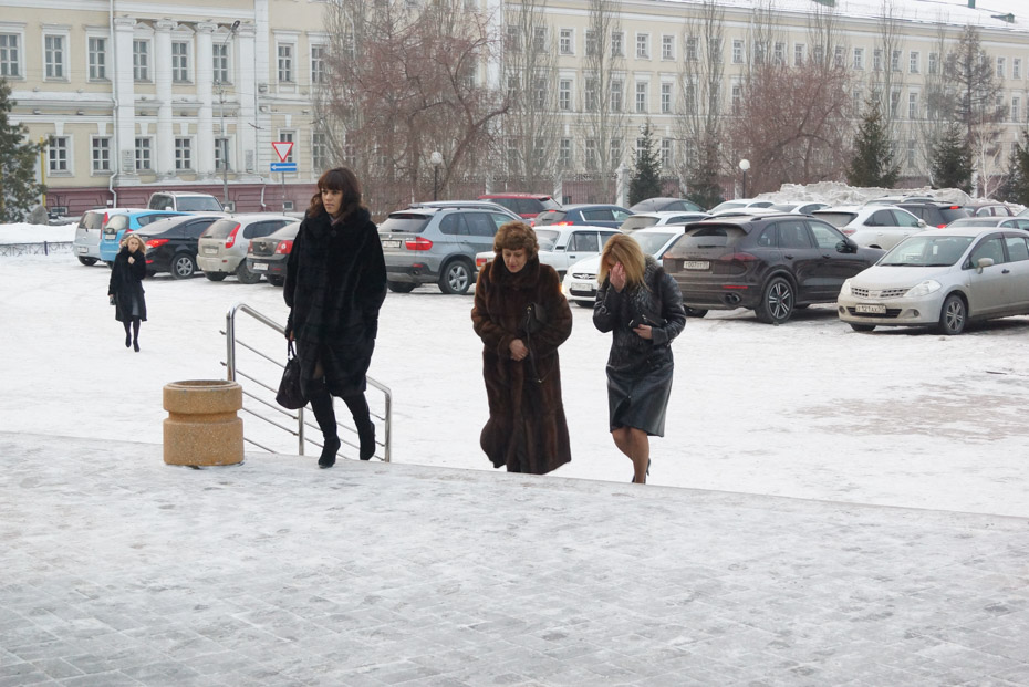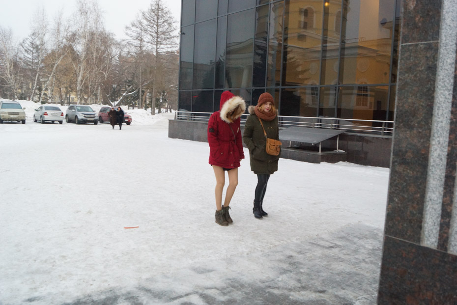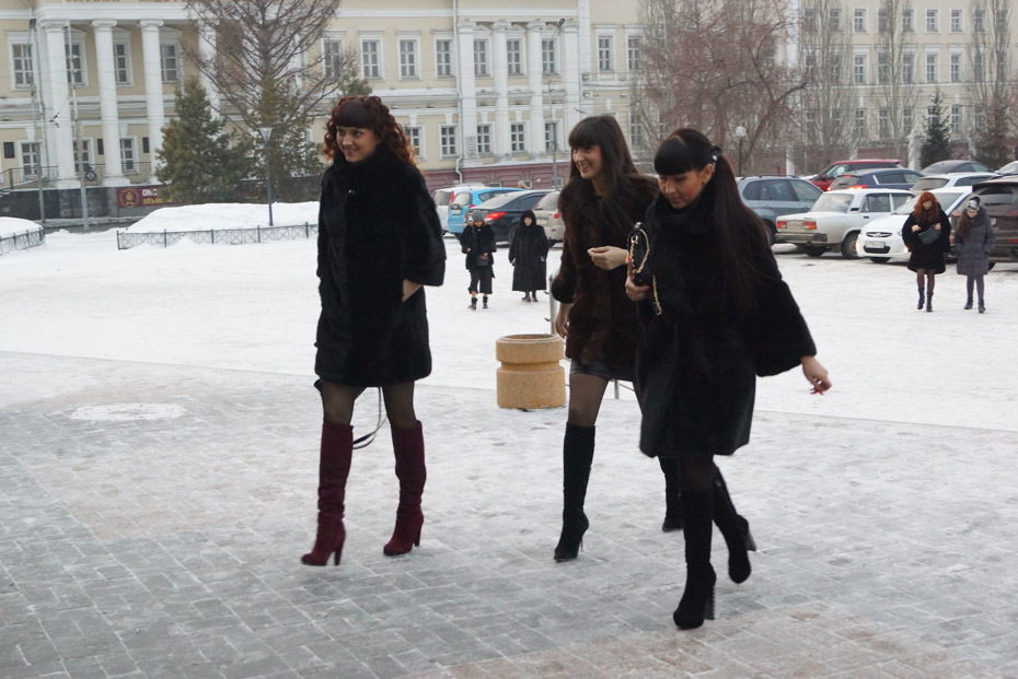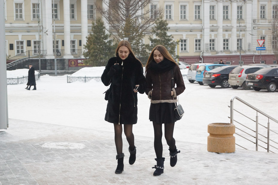 Молоденькие девушки, спешившие на концерт, не стали надевать головные уборы и вообще предпочли не утепляться.