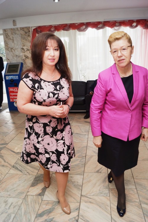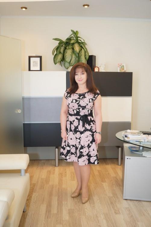 Главный врач санатория «Рассвет» предпочла для выхода в свет женственное платье крупным с цветочным принтом и открытыми, несмотря на раннюю весну, руками.
